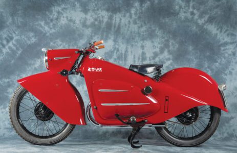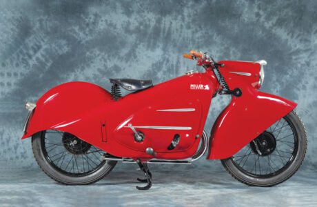 By the mid-1930s, the company was trading as Miller-Balsamo and had designed its own 250cc, and then 500cc, 4-stroke single-cylinder engines to replace the Rudge power units. Miller-Balsamo was soon heading in a direction towards an enclosed machine in 1938 with the launch of the 98cc Schermata — Italian for “Screen” or “Shield.” Looking to the future of motorcycling, in 1939 the streamlined Miller-Balsamo 200 Carenata was launched. Notably, the Italian word most often associated with a fairing is Carenatura — perhaps Miller-Balsamo chose to shorten that to Carenata for this fully-faired machine.