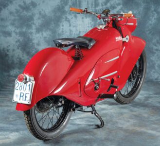 Although the Carenata did not meet sales expectations prior to World War II, the model did reappear postwar alongside more traditionally designed motorcycles powered by 4-stroke single-cylinder engines in 250cc and 500cc sizes. However, by 1950, the Carenata is no longer in the company’s range of motorcycles. Production of Miller-Balsamo powered two-wheelers was winding down by 1957, when the company launched its last new model, a 49cc moped. Ultimately, motorcycle production ended in 1959. Now quite rare, John knows of only three other Miller-Balsamo 200 Carenata motorcycles.
