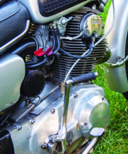 The Honda CL 77 Scrambler rounded out Honda’s 305cc motorcycle lineup. Honda’s Scrambler model started life as the 250cc CL 72, and then in 1965, Honda upped the displacement to 305cc. The Scrambler was a kickstart-only proposition (the frame downtube needed the real estate in front of the crankcase occupied by the Super Hawk and Dream electric starters). The Scrambler had twin carbs and redlined at 9,000rpm, where it produced 27.4 horsepower. It had slightly less compression than the Super Hawk but made more torque with its different cam profiles. Like the Dream and the Super Hawk, the Scrambler had a single overhead cam, two valves per cylinder, a 4-speed transmission and a wet clutch. The Scrambler had the Super Hawk’s Type I 180-degree firing order.