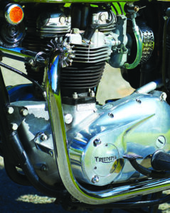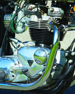Dennis says that the 1970 Triumph twins were “the last of the good ones.” Triumph motorcycles had become popular in the United States after World War II, and the British firm increasingly geared its offerings to the U.S. market, which bought style, chrome and horsepower, unlike the English, who wanted fuel economy and weather protection. Triumphs were sought after for desert racing in the Western states, and getting around and general mayhem everywhere else. In the 1950s, Triumph put out a quality product: warranty claims were low.
