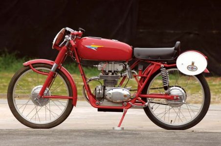 A single cam version was also built. In one printed interview, Taglioni was quoted as saying the twin cam was too heavy to effectively compete in the Giro d’Italia, Italy’s famed endurance motorcycle race. Ceccato fairly dominated the races the company entered with machines powered by both the twin cam and single cam 75cc engines. A long list of race victories, including the first nine of 10 positions at the Giro d’Italia in 1956, helped put Ceccato’s name in the record books.