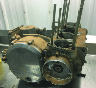While the crankcase was still bolted together, every other engine component was apart. At Retrospeed, the cases were split and all cast aluminum components — crankcase halves, cylinder and head, were tumbled in a medium that cleaned the surface and brought back the factory-cast appearance.
