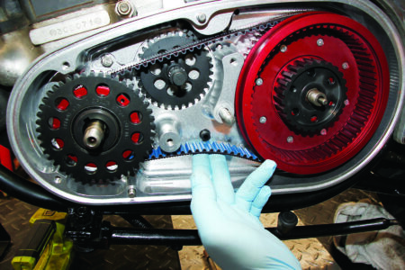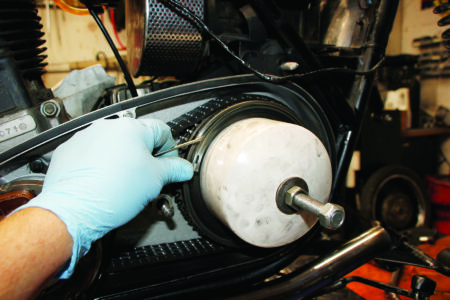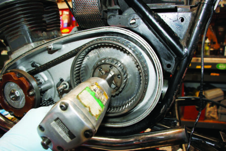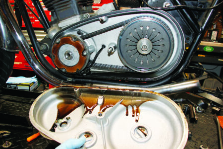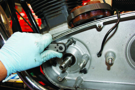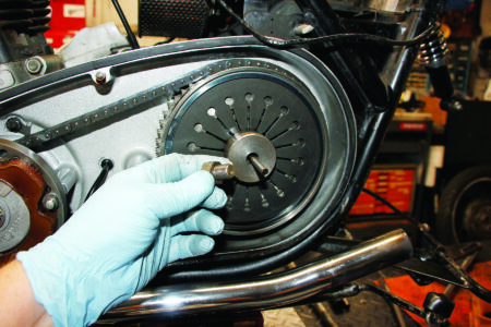 1. Begin by disconnecting the battery. Find the two wires running from the alternator to the wiring harness and unhook them. Disconnect the wires running to the rear brake switch and remove the rear brake pedal. Remove the center bolt from the outer chain case and drain the primary case. Remove the primary cover.