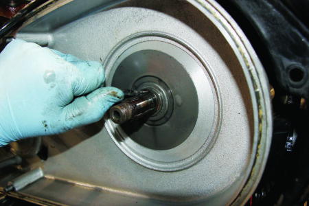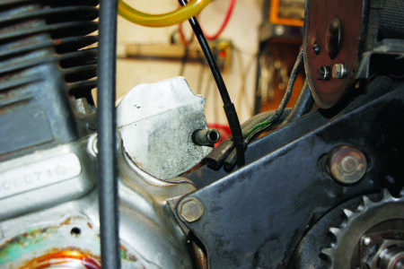 9. Place the new inner chaincase in place, along with the new gasket. Install and finger tighten at least two of the supplied screws that hold the case in place. This is so you can measure the gap between the cover stud and the back of the chaincase. You’ll fill the gap with a combination of the supplied shims.
