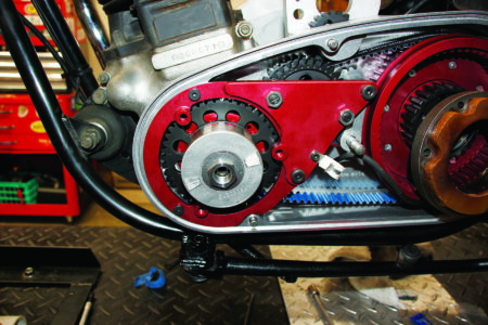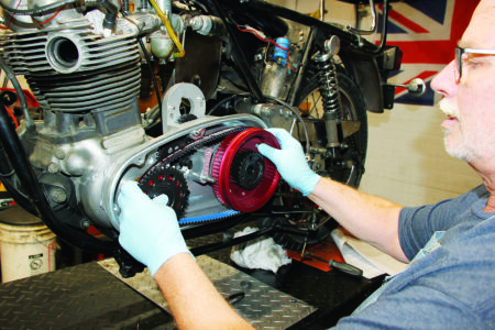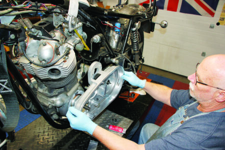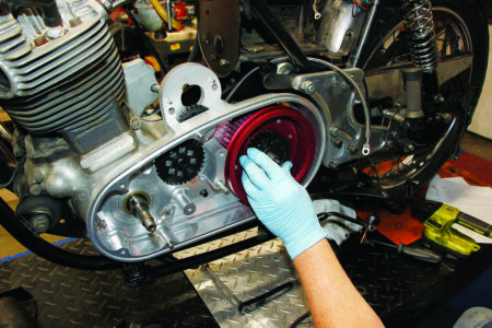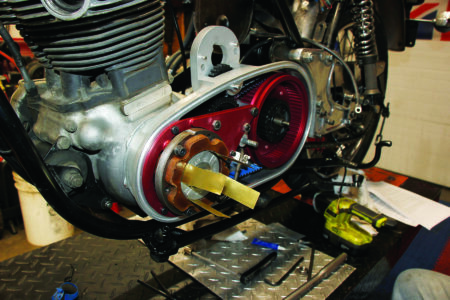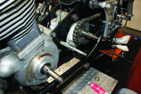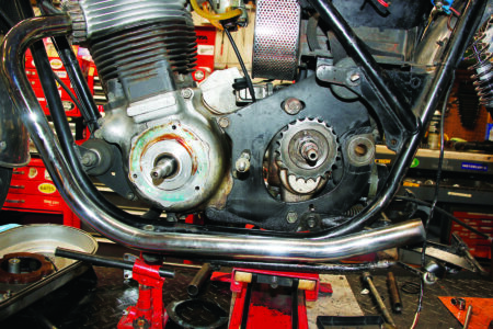 7. Here’s the machine minus the primary case. Inspect the primary sprocket and replace it if it shows signs of wear. You might also want to go up or down a tooth to change bike performance. The swing arm is off of this bike for bushing and pin replacement. I think the British say “In for a penny, in for a pound” or in this case many Pounds. The result should be a better handling bike.