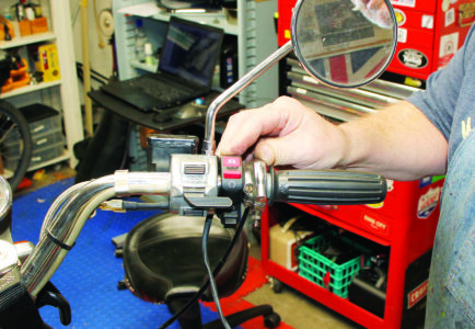 21. A nice combination starter/kill switch comes with the kit, mount it inboard of your throttle and run the wires alongside the existing wires and into the headlight bucket.