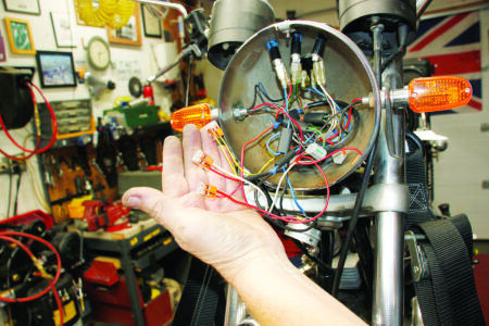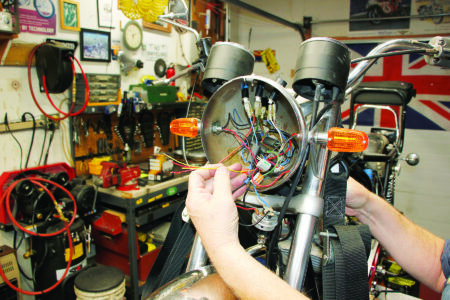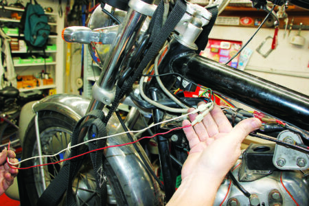22. Now is the time to lay out the wiring harness supplied with the kit alongside the frame backbone and run the long single wire into the headlight bucket.