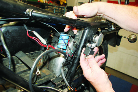 25. Mount the starter relay behind the rear downtube, using the supplied stainless bolt through the lower screw of the side panel mount. This bolt is longer than stock to accommodate the relay bracket. This step can take a little of what the Britishcall “fettling,” it may be easier if you remove the rectifier, mount the relay and then reinstall the rectifier. Connect the wiring harness plug to the relay and route the harness behind the battery carrier.