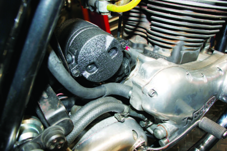8. Back to the current task. As mentioned, the ham can has to be removed. Once that is out of the way, you have easier access to the breather stub off the back of the timing case. Unscrew it. CNW has provided a slightly shorter one that won’t foul the starter motor. Replace the stock pipe with the supplied shorter pipe.